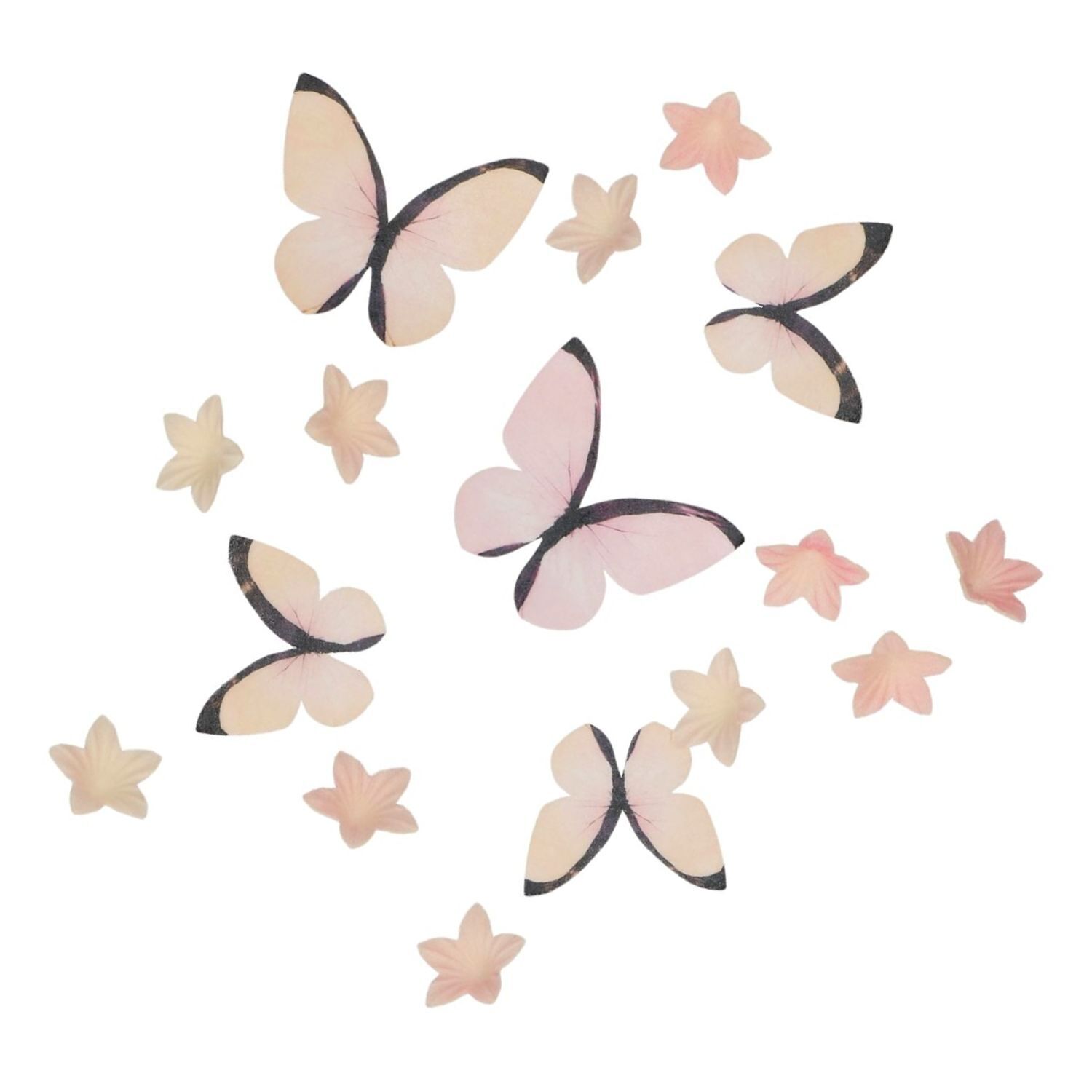 Este encantador set incluye 30 piezas delicadas en forma de flores y mariposas, decoradas en tonos rosados degradados que aportan un toque romántico, elegante y primaveral a cualquier creación dulce.